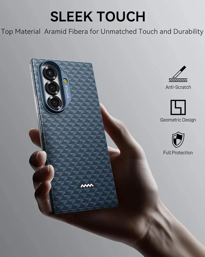 • Ultra-Light Military-Grade Defense:ย Made from aerospace-grade aramid fibreโ€”5x stronger and 50% lighter than steelโ€”for rugged protection without the bulk. The precision-woven, non-conductive structure provides reliable defense while resisting scratches, discoloration, and yellowing, all with a cloud-like, no-slip grip.