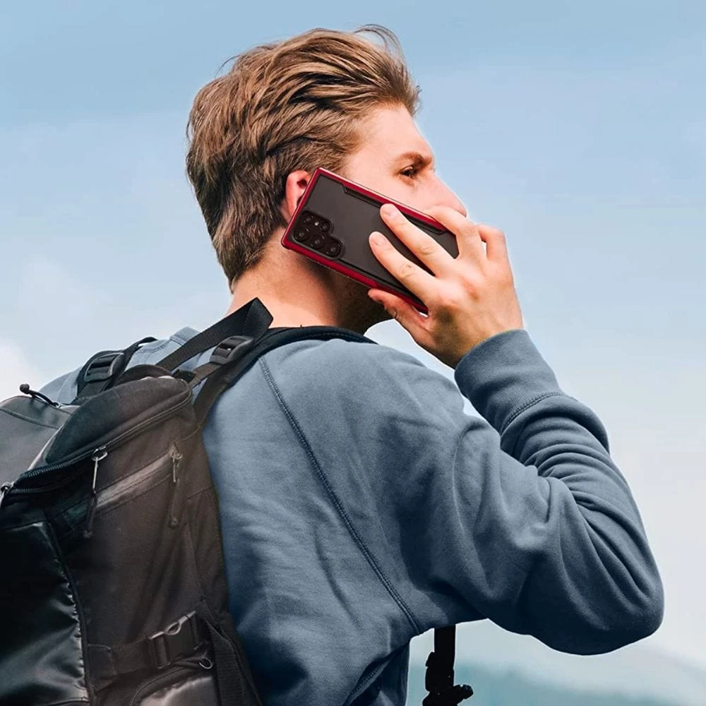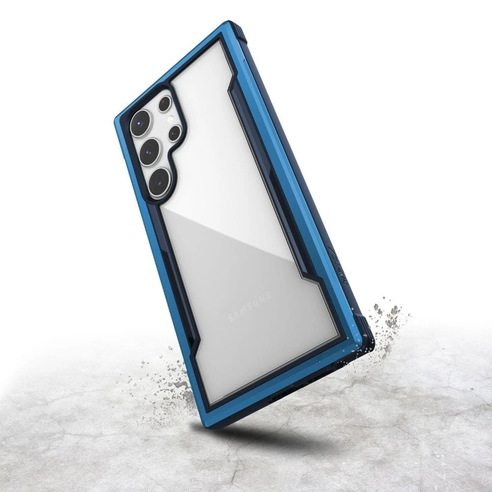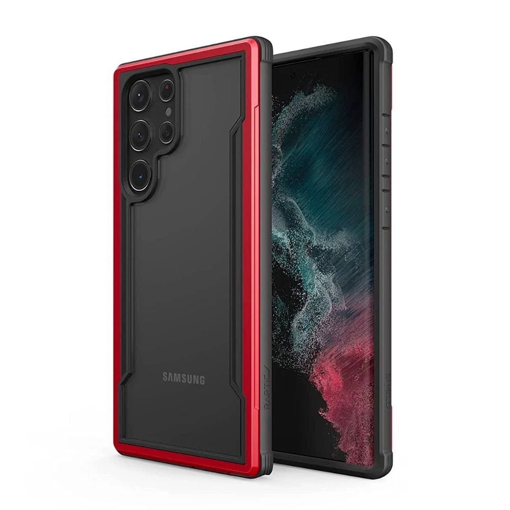 The Raptic Shield case for the Samsung Galaxy S23 Ultra made of hard polycarbonate, soft rubber, and anodized aluminium, and it provides military-grade protection. The case has a sleek and edgy design with a clear polycarbonate back to show off the phone.ย
