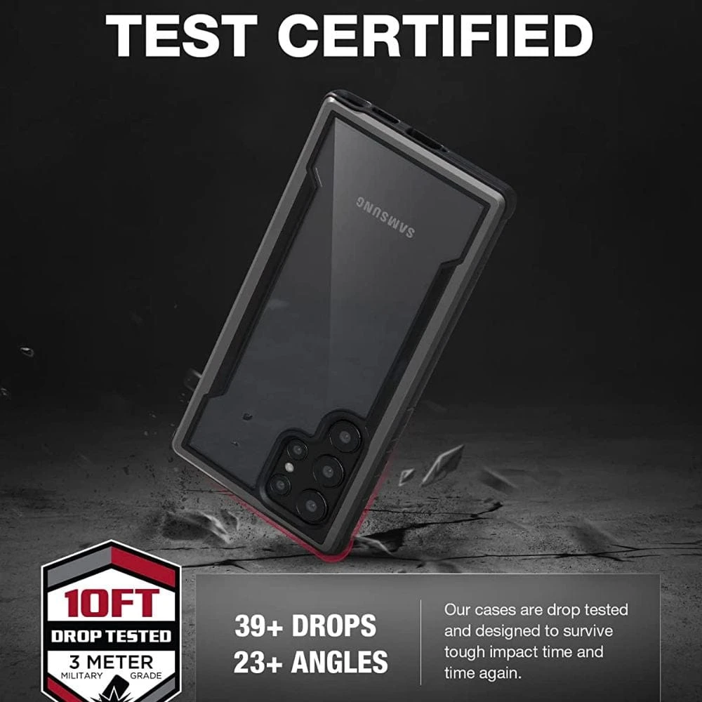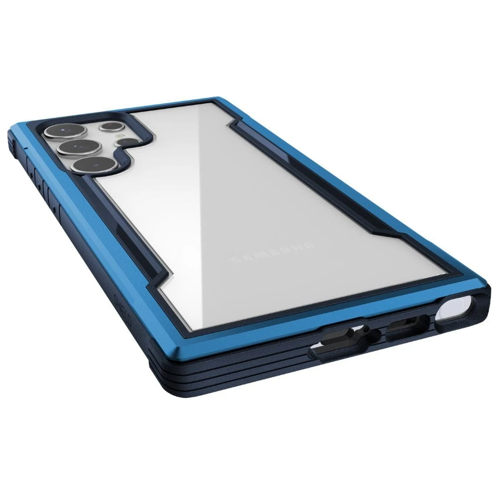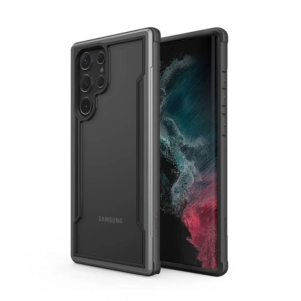The Raptic Shield case for the Samsung Galaxy S24 Ultra made of hard polycarbonate, soft rubber, and anodized aluminium, and it provides military-grade protection. The case has a sleek and edgy design with a clear polycarbonate back to show off the phone.ย