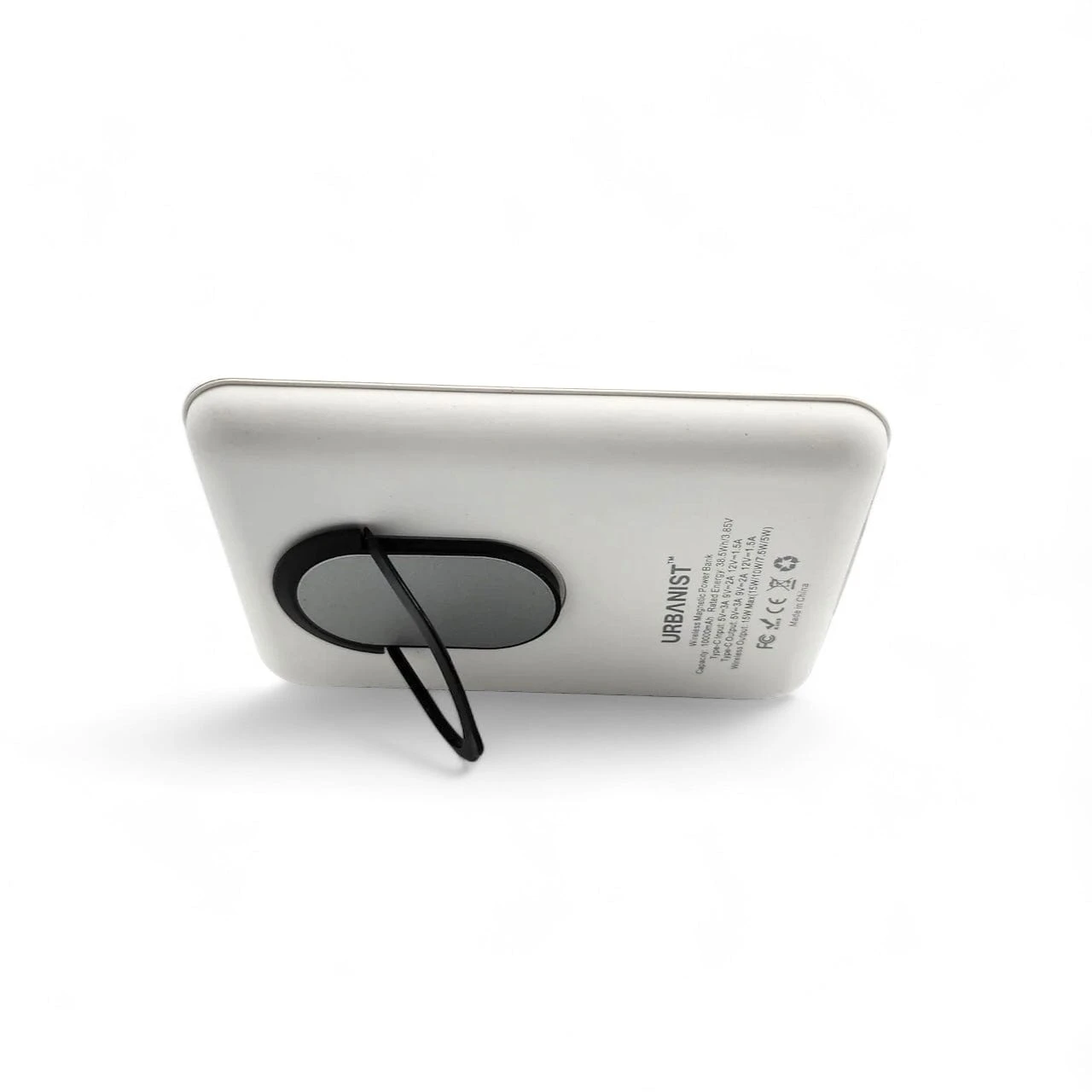 Urban MagPower10 is a wireless standing power bank with hands-free viewing capabilities. It features magnetic wireless charging and is compatible with all magsafe devices for iPhone 12, iPhone 13, and iPhone 14. It also features a Type-C port with 20W of charging power and a pearl white finish. The included kickstand allows for hands-free landscape and portrait viewing.